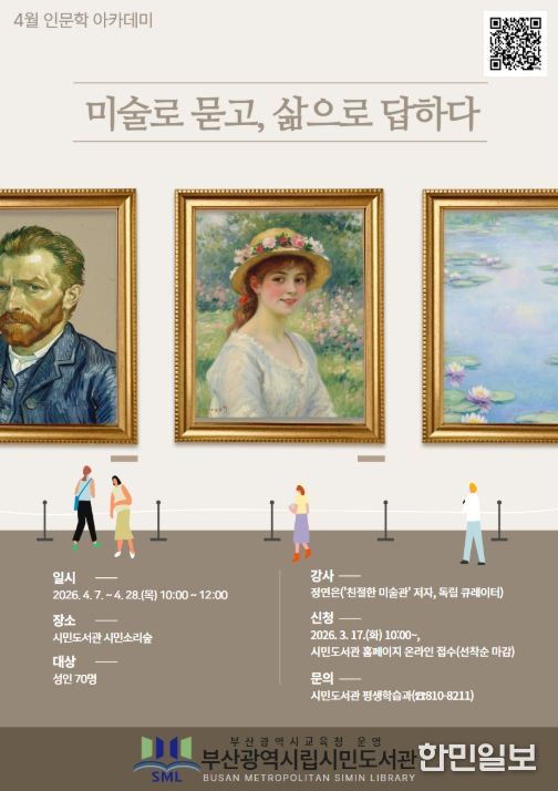 한민일보 서울포커스 임광현 기자 | 부산시교육청 시민도서관은 4월 7일부터 28일까지 매주 화요일마다 시민도서관 내 시민소리숲에서 성인 70명을 대상으로 4월 인문학 아카데미 ‘미술로 묻고, 삶으로 답하다’를 운영한다.