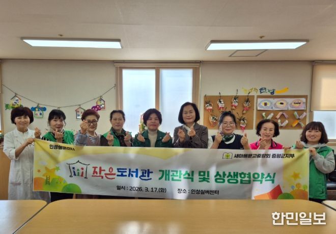 한민일보 서울포커스 김다남 기자 | 새마을문고중앙회 증평군지부(회장 강미영)가 17일 인성실버센터에서 ‘새마을문고 작은도서관’개관식과 상생 협약식을 개최했다.