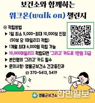 한민일보 서울포커스 진광성 기자 | 영월군은 지역주민의 걷기 실천을 활성화하고 건강증진을 도모하기 위해 모바일 걷기 앱 ‘워크온(WalkOn)’을 활용한 '2026년 워크온 챌린지'를 운영한다고 밝혔다.