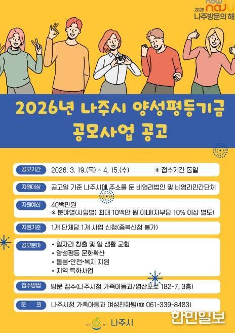 한민일보 서울포커스 임광현 기자 | 전남 나주시가 일·생활 균형과 양성평등 문화 확산, 돌봄과 안전 복지 지원을 위한 ‘2026년 나주시 양성평등기금 공모사업’을 추진한다.
