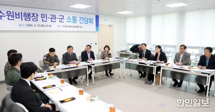 한민일보 서울포커스 진광성 기자 | 수원특례시의회는 19일 의회 세미나실에서 공항 소음피해지역 주민들과 군, 시 관계자가 함께하는 ‘민·관·군 소통 간담회’를 개최하고 소음피해 해소를 위한 실질적인 대응 방안 마련에 나섰다.