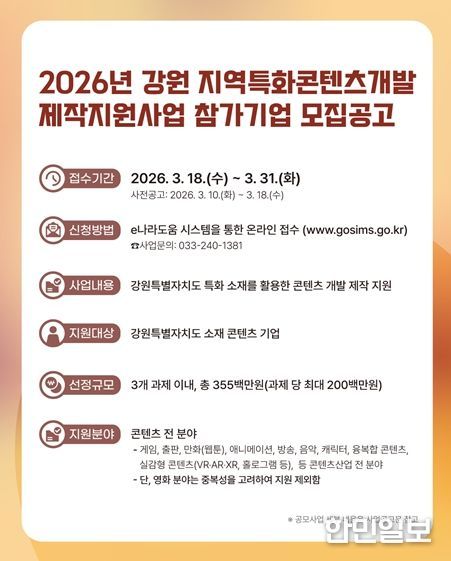 한민일보 서울포커스 곽중희 기자 | 강원문화재단에서는 강원지역 우수 콘텐츠 발굴 및 지역 콘텐츠 기업의 성장을 도모하기 위한 공모사업을 진행한다.