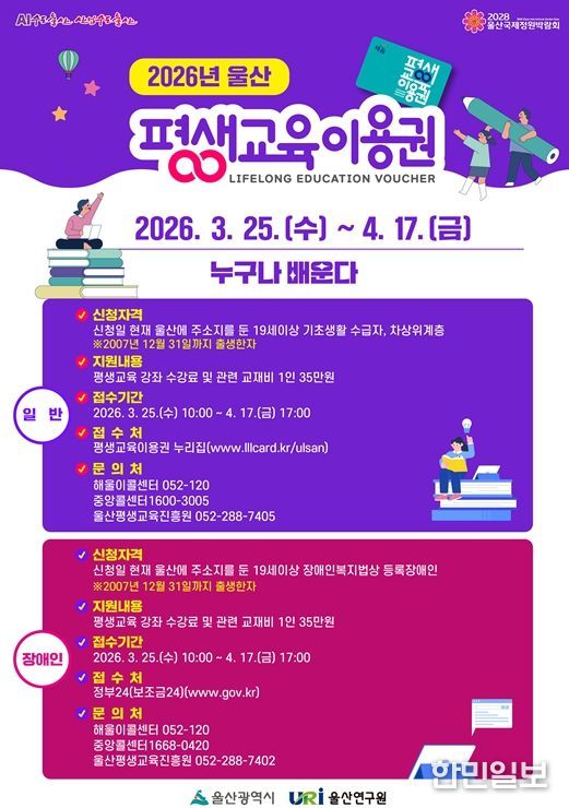 한민일보 서울포커스 임경복 기자 | 울산시는 시민 누구나 평생학습의 기회를 누릴 수 있도록 ‘2026년 울산광역시 평생교육이용권(이하 이용권) 지원사업’을 본격 추진한다고 밝혔다.