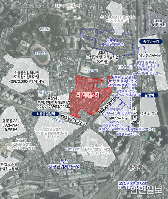 대상지는 1호선 남영역, 6호선 및 경의·중앙선 효창공원앞역 더블 역세권에 위치하고 있으며, 주변 간선도로변에는 경의선 숲길 근린공원, 문배업무지구 및 상업시설이 입지하여 다채로운 도시공간을 형성하고 있는 지역이다.