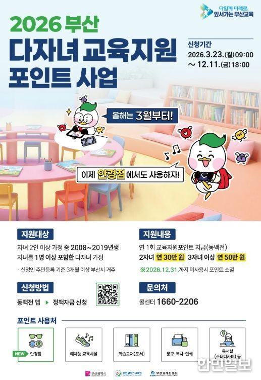 한민일보 서울포커스 임광현 기자 | 부산광역시교육청은 저출생 문제에 대응하고 학부모의 교육비 부담을 덜어주기 위한 지원책의 하나로 다자녀가정에 지급하는 ‘교육지원포인트’ 신청을 23일부터 접수받는다고 밝혔다.
