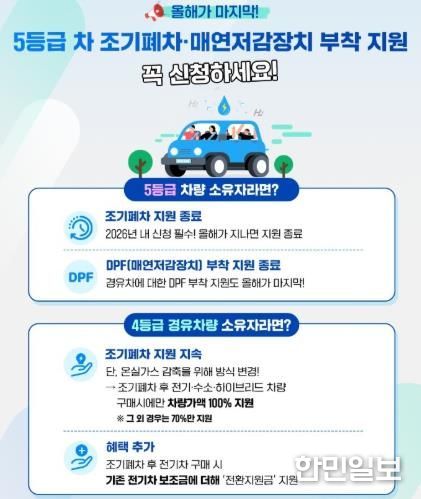 김정섭 전남도 환경산림국장은 “노후 차량·건설기계는 미세먼지의 주요 배출원인 만큼 조기 폐차와 엔진 교체 등을 통해 도민이 체감하는 대기질 개선에 힘쓰겠다”며 “특히 5등급 차량 조기 폐차·매연 저감장치 부착, 건설기계 엔진 교체 지원은 올해 종료될 예정으로 대상 차량 소유자가 이번 기회를 놓치지 않길 바란다”고 말했다.
