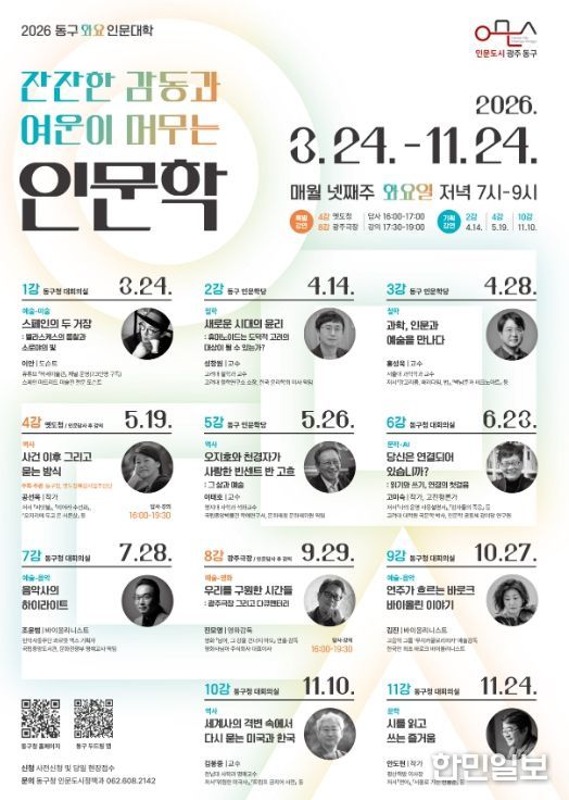 한민일보 서울포커스 임경복 기자 | 광주 동구는 ‘잔잔한 감동과 여운이 머무는 인문학’을 주제로 예술, 철학, 역사, 문학 등 각 분야의 명망 있는 강사들을 초청해 진행하는 ‘동구 화요 인문대학’을 24일 개강한다고 밝혔다.