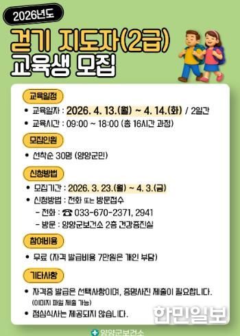 한민일보 서울포커스 진광성 기자 | 양양군보건소가 지역사회 내 자발적인 걷기 실천 분위기를 조성하고 주민 건강 지표를 개선하기 위해 ‘2026년 지역사회 걷기지도자(2급) 양성 과정’을 운영한다.