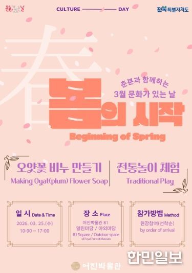 한민일보 서울포커스 김용택 기자 | 전주시 어진박물관은 오는 25일 ‘3월 문화가 있는 날’을 맞아 ‘봄의 시작’을 주제로 체험프로그램을 운영한다.