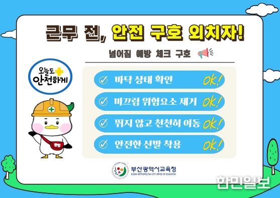 부산광역시교육청은 산업재해 통계자료 분석을 기초로 지난해 2분기 자주 발생했던 ‘넘어짐’ 사고를 예방하기 위한 행동수칙 안내문을 현장에 배포했다고 24일 밝혔다.