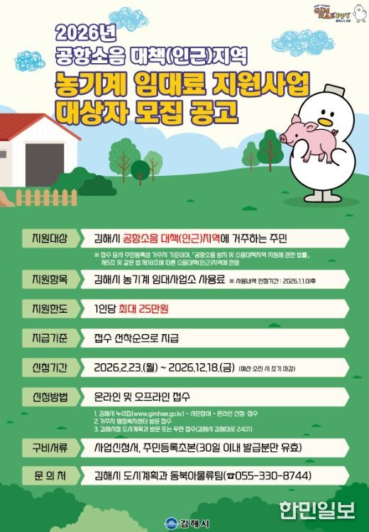 이 사업은 2026년 1월 1일 이후 김해시 농기계 임대사업소를 이용하고 납부한 임대료를 지원하는 것으로, 올해 개인별 지원 한도는 전년 대비 10만원 상향돼 농업인의 실질적인 경영비 절감효과가 기대된다.