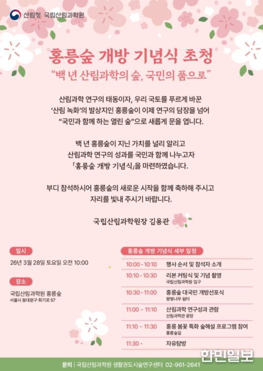 홍릉숲은 우리나라 산림과학 연구의 태동과 성장을 함께 해 온 상징적인 공간이다. 이번 개방으로 국민이 숲의 혜택을 직접 누리고, 기후위기 시대 산림과학 연구의 중요성을 체감하는 계기가 될 것으로 기대된다.