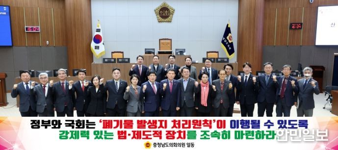 이에 충남도의회는 ▲발생지 처리 원칙의 실질적 이행을 위한 강제력 있는 법·제도적 장치 마련 ▲수도권 폐기물의 지방 이전 구조 개선 및 폐기물 처리 공공성 강화 법률 추진 ▲국가 책임 아래의 공공 폐기물 처리시설 확충및 주민 지원·상생 제도 법제화 등을 정부와 국회에 촉구했다.