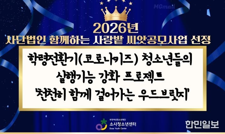 한민일보 서울포커스 김윤이 기자 | 부천여성청소년재단이 운영하는 소사청소년센터가 사단법인 함께하는 사랑밭 주관 ‘2026년 함께하는 사랑밭 [씨앗공모사업]’ 기획공모 분야에 ‘학령전환기(코로나키즈) 청소년들의 실행기능 강화 프로젝트-천천히 함께 걸어가는 우드브릿지’ 프로그램이 선정됐다.