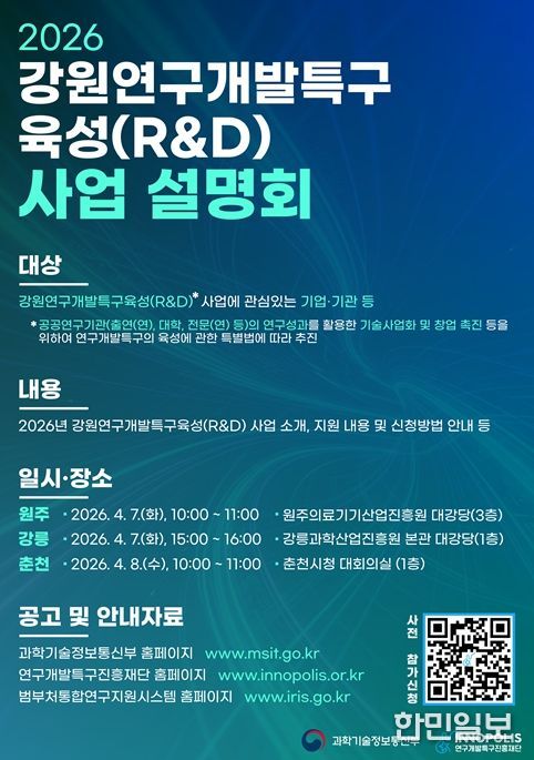 한민일보 서울포커스 곽중희 기자 | 연구개발특구진흥재단과 강원특별자치도는 ‘2026년 강원연구개발특구육성(R·D) 사업 설명회’를 4월 7일 원주·강릉, 8일 춘천에서 개최한다고 밝혔다.