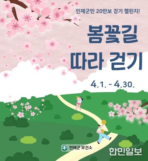 한민일보 서울포커스 진광성 기자 | 인제군이 군민의 일상 속 걷기 실천을 확산하고 건강한 생활문화를 만들기 위해 4월 1일부터 4월 30일까지 ‘4월 한달 간 20만보 걷기챌린지’를 운영한다.