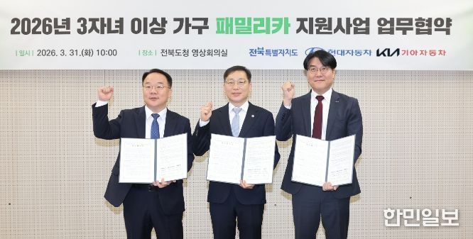 한민일보 서울포커스 박용남 기자 | 전북특별자치도가 현대자동차·기아와 손잡고 자녀 3명 이상 다자녀가구를 위한 패밀리카 구입비 지원사업을 전국 최초로 본격 가동한다.