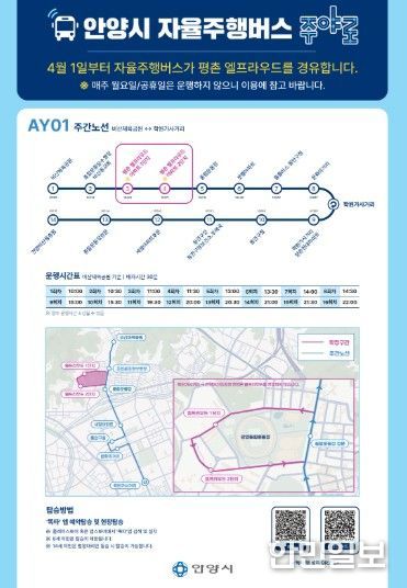 한편, 안양시 자율주행 버스 ‘주야로’는 심야 시간대 교통 편의를 위해 야간 노선도 운영 중이다. 야간 노선(노선 번호 'AY02')은 인덕원역·범계역·안양역을 연결하며, 대중교통 취약 시간대인 자정부터 오전 2시 30분까지 기존대로 운행한다.