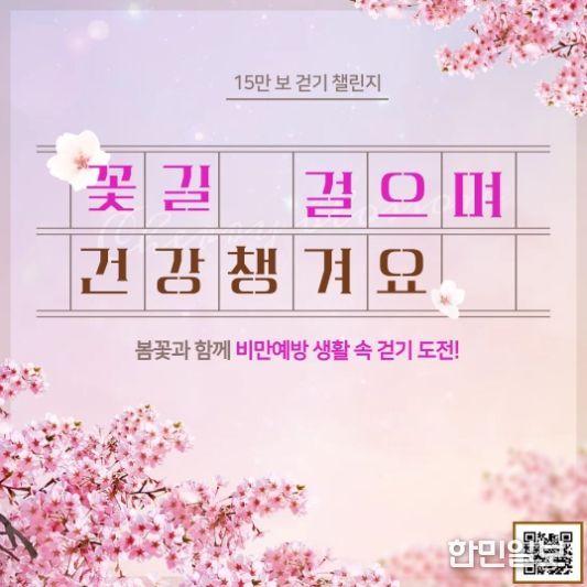 이번 챌린지는 총 15만보 걷기 달성하고, 봄꽃 길이나 공원 등 야외 공간에서 걷기를 실천하는 사진을 1회 인증하는 것이 목표이다. 이를 통해 참여자들이 꾸준한 걷기 습관을 형성하여, 주민들이 일상에서 자연스럽게 신체활동을 늘리고 걷기를 통해 비만을 예방함으로써 건강 증진과 스트레스 완화를 동시에 도모할 수 있는 것이 특징이다.