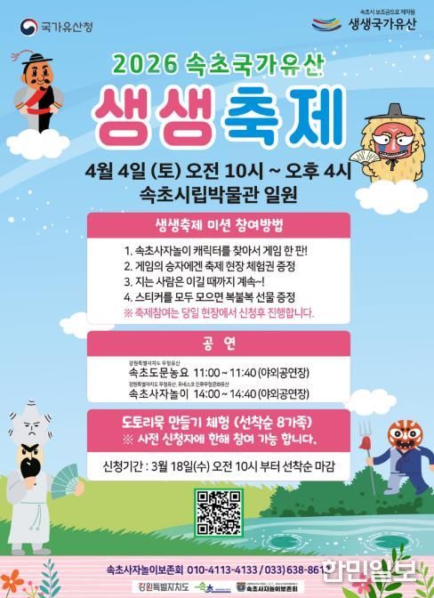 한민일보 서울포커스 임경복 기자 | 국가유산청 공모사업인 ‘2026년 생생국가유산 사업’의 하나로 마련된 ‘2026 속초국가유산 생생축제’가 오는 4월 4일(토) 속초시립박물관에 열린다.