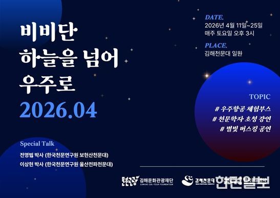 한민일보 서울포커스 김은금 기자 | 김해문화관광재단 김해천문대가 공항소음대책지역 주민을 위한 과학문화체험 행사 ‘비비단, 하늘을 넘어 우주로’를 오는 4월 11일부터 25일까지 매주 토요일 총 3회에 걸쳐 운영한다.