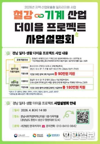 한민일보 서울포커스 김서윤 기자 | 창원특례시는 오는 4월 8일 오후 2시 경남사회적경제혁신타운 1층 다목적홀에서 ‘2026 철강·기계산업 일터-생활 더이음 프로젝트’ 사업설명회를 개최한다고 밝혔다.