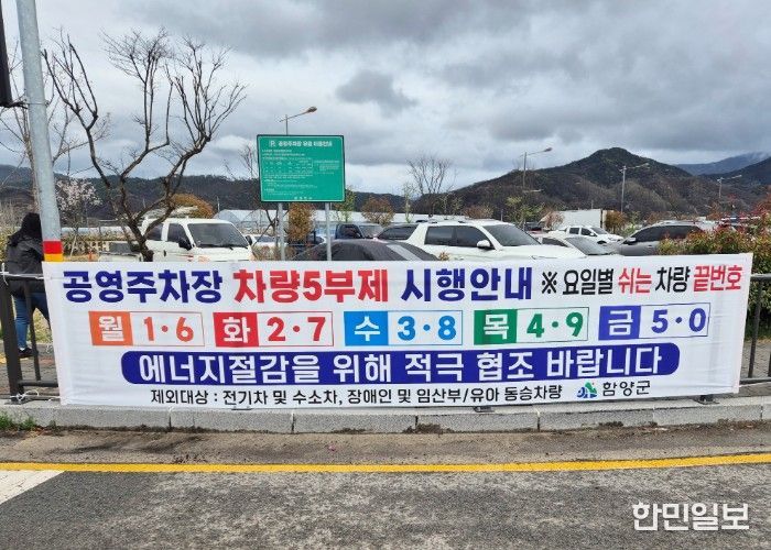 한민일보 서울포커스 김서윤 기자 | 함양군은 정부의 에너지 절약 방침에 따라 대중교통 이용을 유도하기 위해 4월 8일부터 공영주차장 승용차 5부제를 시행한다고 밝혔다.
