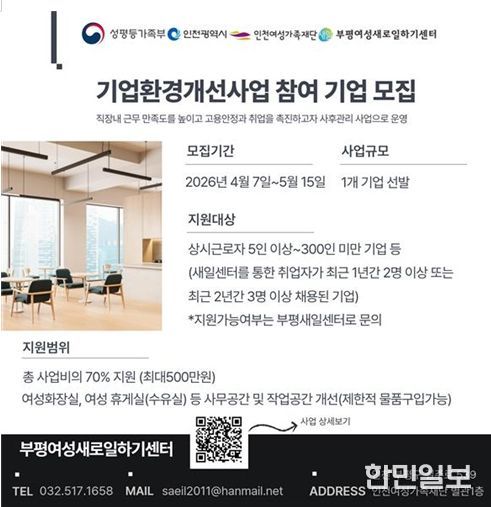 한민일보 서울포커스 유창렬 기자 | 부평여성새로일하기센터는 여성친화적 근무환경 조성과 경력보유여성의 안정적인 고용 확대를 위해 '2026년 기업환경개선사업' 참여기업을 모집한다고 밝혔다.