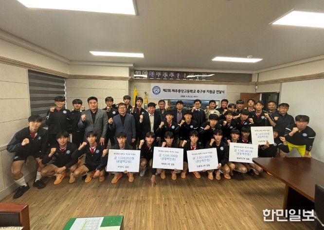 한민일보 서울포커스 임경복 기자 | 제주도교육청 제주중앙고등학교는 8일 도내 생활체육 축구 문화를 이끄는 오름축구회, 돌담축구회, 백록축구회, 소낭축구회, 우리축구회(FC) 등 5개 단체로부터 ‘제2회 제주중앙고 축구부 지원금 전달식’을 통해 장학금 700만원을 전달받았다.