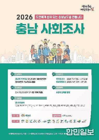 한민일보 서울포커스 유돈상 기자 | 논산시는 오는 4월 13일부터 5월 4일까지 관내 1,020가구의 만 15세 이상 가구주 및 가구원을 대상으로 ‘2026 충남사회조사’를 실시한다.