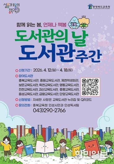 한민일보 서울포커스 임경복 기자 | 충청북도교육청은 12일부터 18일까지 이어지는 '도서관 주간'을 맞아 교육도서관을 중심으로 다양한 독서문화 행사를 운영한다고 밝혔다.