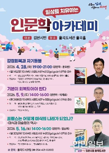한민일보 서울포커스 임경복 기자 | 김천시립율곡도서관(관장 이신기)은 시민들의 정서적 회복과 인문학적 소양 함양을 위해 오는 4월 28일부터 '일상을 치유하는 인문학 아카데미'를 운영하고 참가자를 모집한다고 밝혔다.