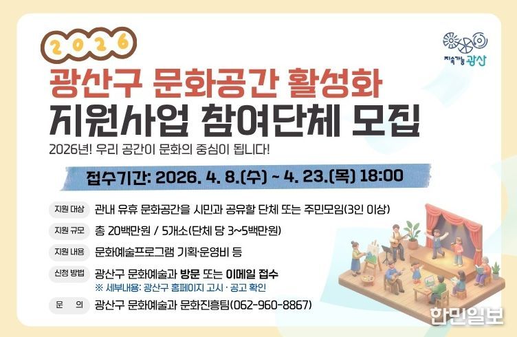한민일보 서울포커스 임경복 기자 | 광주 광산구가 지역 유휴 문화공간을 열린 시민 문화 거점으로 활용하는 ‘2026년 문화공간 공유 활성화 지원사업’을 추진한다.