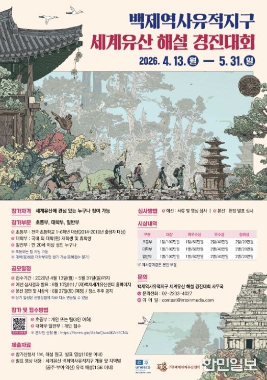 한민일보 서울포커스 유돈상 기자 | (재)백제세계유산센터는 세계유산에 대한 국민적 관심을 높이고, 창의적인 해설 인재를 발굴하기 위해 '백제역사유적지구 세계유산 해설 경진대회'를 개최하고, 4월 13일부터 5월 31일까지 참가자를 모집한다.