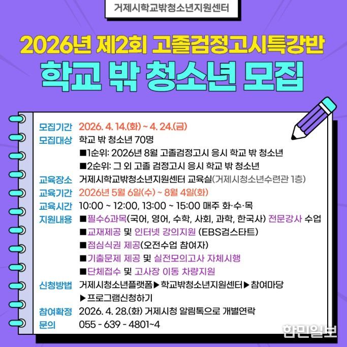 한민일보 서울포커스 김은금 기자 | 거제시학교밖청소년지원센터에서는 2026년도 제2회 고등학교 졸업학력 검정고시 대비 검정고시특강반에 참석할 학교 밖 청소년을 모집한다.