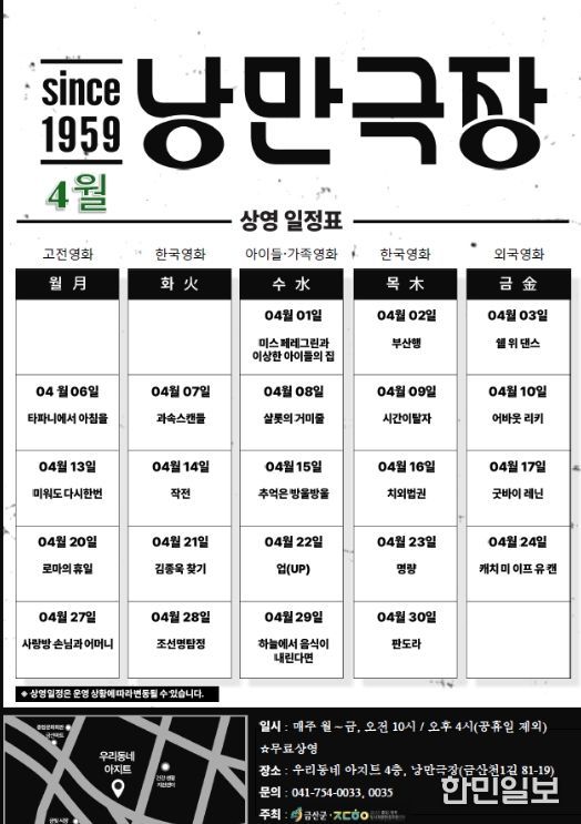 특히 요일별 테마를 반영해 △월요일 고전영화 △화요일·목요일 한국영화 △수요일 가족영화 △금요일 외국영화를 상영함으로써 다양한 연령층이 함께 즐길 수 있도록 프로그램을 구성했다.