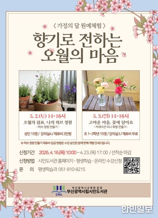 한민일보 서울포커스 임광현 기자 | 부산광역시립시민도서관은 오는 5월 2일과 3일 시민도서관 강의실에서 성인과 초등학생 30명을 대상으로 가정의 달 원예체험 ‘향기로 전하는 오월의 마음’을 운영한다.