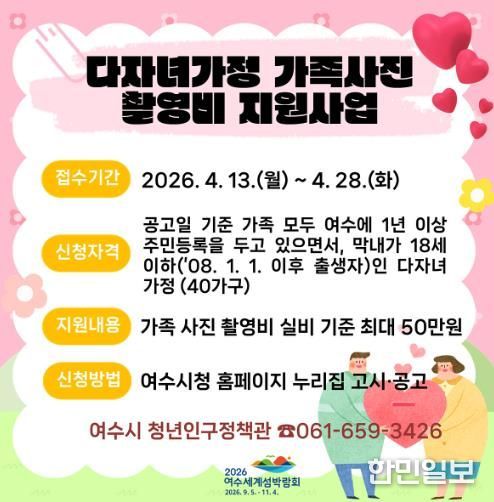 한민일보 서울포커스 임광현 기자 | 여수시가 다자녀 가정의 소중한 일상을 기록하고 가족 간 유대감을 높이기 위해 가족사진 촬영비 지원에 나선다.