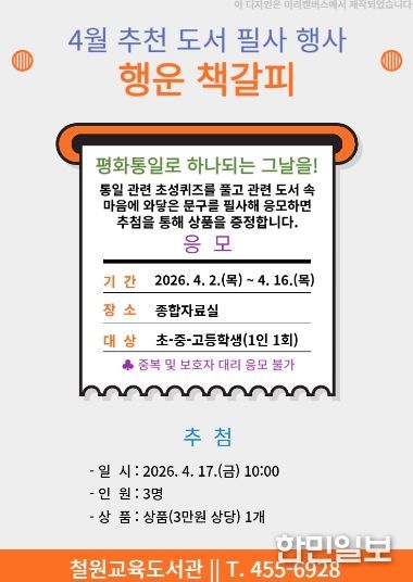 한민일보 서울포커스 진광성 기자 | 철원교육도서관(관장 김민서)은 4월부터 11월까지 종합자료실에서 지역 초·중·고 학생을 대상으로 추천 도서 필사 행사 ‘행운 책갈피’를 8회 운영한다.