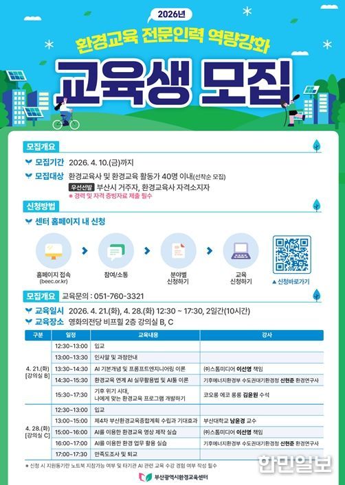 한민일보 서울포커스 임광현 기자 | 부산시는 변화하는 환경정책과 교육 수요에 대응하고 지역 환경교육 전문인력의 역량 강화를 위해 오는 4월 21일과 28일 이틀간 해운대구 영화의전당에서 '2026년 환경교육 전문인력 역량강화 교육'을 실시한다고 밝혔다.