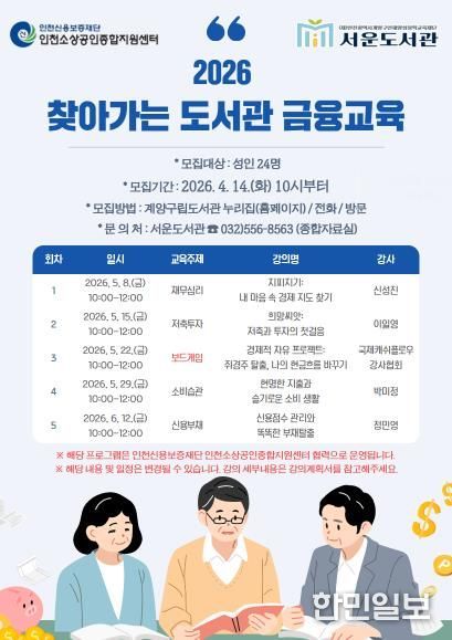 한민일보 서울포커스 김성혜 기자 | 인천시 계양구 서운도서관은 지역주민의 실생활 금융역량 강화를 위해 오는 5월 8일부터 6월 12일까지 성인을 대상으로 ‘2026 찾아가는 도서관 금융교육’을 운영한다고 밝혔다.