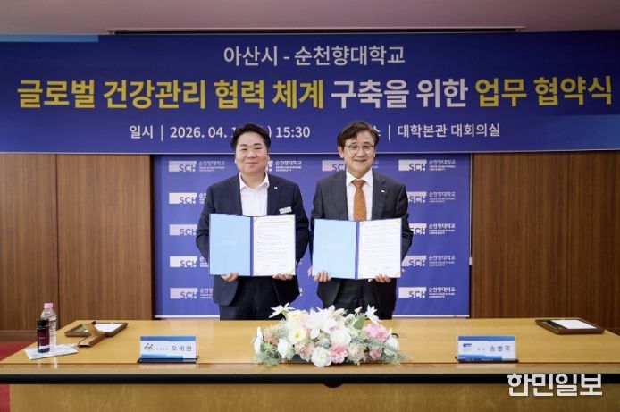 한민일보 서울포커스 임경복 기자 | 아산시와 순천향대학교가 지난 15일 순천향대학교 본관 3층 대회의실에서 ‘글로벌 건강관리 협력체계 구축’을 위한 업무협약을 체결했다.