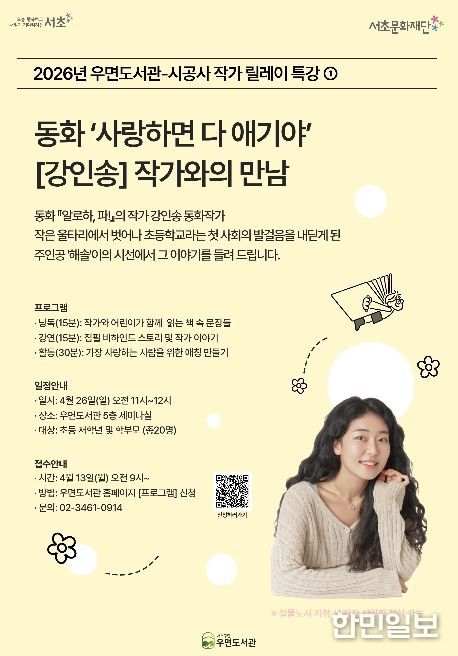 우면도서관이 출판사 시공사와 협력해 마련한 이번 특강은 최근 스마트폰 등 디지털 미디어에 익숙해진 아이들이 독서에 대한 심리적 장벽을 허물고, 작가와의 직접적인 만남을 통해 긍정적인 독서 경험을 쌓을 수 있도록 돕는 프로그램이다. 이달 26일과 다음달 10일 두 차례에 걸쳐 초등 저학년 어린이와 학부모를 대상으로 진행된다.