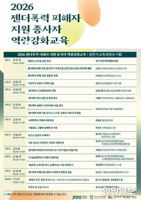 한민일보 서울포커스 김윤이 기자 | 경기도와 경기도젠더폭력통합대응단이 17일 도내 젠더폭력 피해 지원 현장 종사자들의 전문성 향상을 위한 ‘2026 역량강화 교육’ 상반기 과정을 시작하며 현장 대응력 강화에 나섰다.