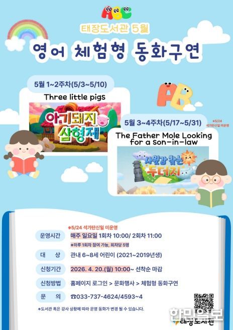 5월에는 ▲아기 돼지 삼형제(Three little pigs) ▲사윗감 찾는 두더지(The father mole looking for a son-in-law) 등 아이들에게 친숙하고 사랑받는 동화를 준비했다. 매주 일요일 오전 10시와 11시 2회차로 운영되며, 참가비는 무료다.