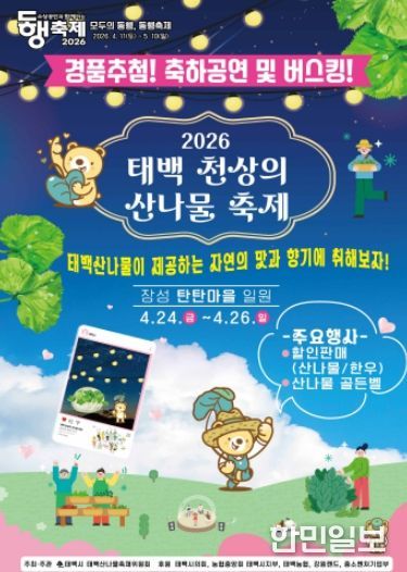한민일보 서울포커스 임경복 기자 | 태백시는 오는 4월 24일부터 26일까지 3일간 장성 탄탄마을(장성중앙시장 일원)에서 ‘2026 태백 천상의 산나물 축제’를 개최한다고 밝혔다.
