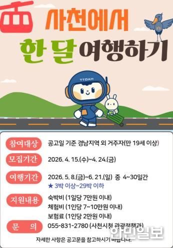 한민일보 서울포커스 김은금 기자 | 사천시는 체류형 관광 활성화와 지역 관광자원 홍보를 위해 ‘사천에서 한 달 여행하기’ 1차 참가자를 4월 15일부터 4월 24일까지 모집한다.