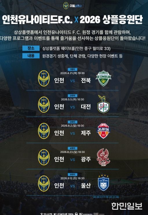 행사는 인천 중구 상상플랫폼 웨이브홀에서 총 5회에 걸쳐 진행된다. 오는 4월 21일 전북현대와의 원정경기를 시작으로 ▲5월 5일 대전 하나시티즌전 ▲8월 2일 제주SK FC전 ▲8월 23일 광주FC전 ▲9월 12일 울산HD FC전 등 주요 원정경기 일정에 맞춰 운영될 예정이다.