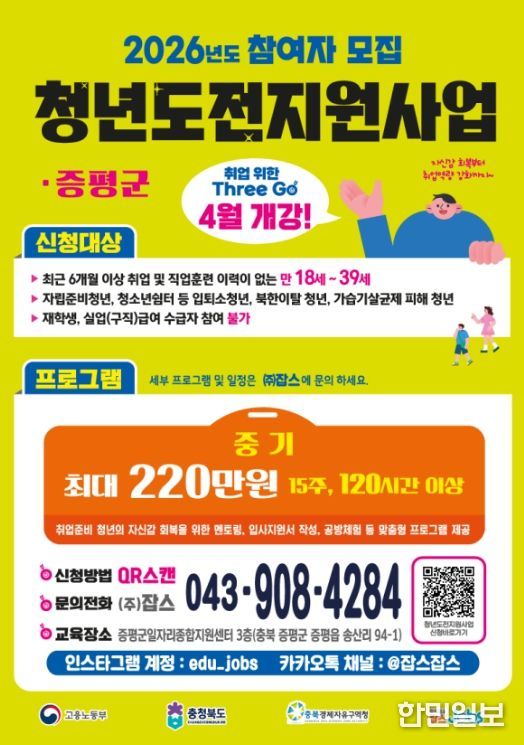한민일보 서울포커스 김다남 기자 | 충북 증평군이 취업 공백 상태에 놓인 청년들의 사회 진입을 돕기 위해 ‘청년도전지원사업’ 중기 프로그램 참여자를 모집한다.