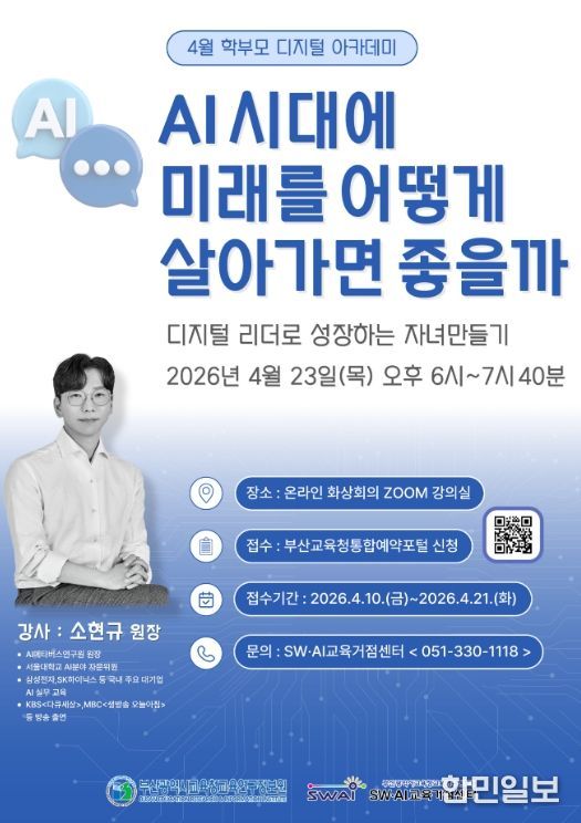 한민일보 서울포커스 임광현 기자 | 부산광역시교육청교육연구정보원은 오는 23일 관내 학부모와 시민을 대상으로 온라인(ZOOM)을 통해 4월 학부모 아카데미 ‘AI시대에 미래를 어떻게 살아가면 좋을까?’를 운영한다.